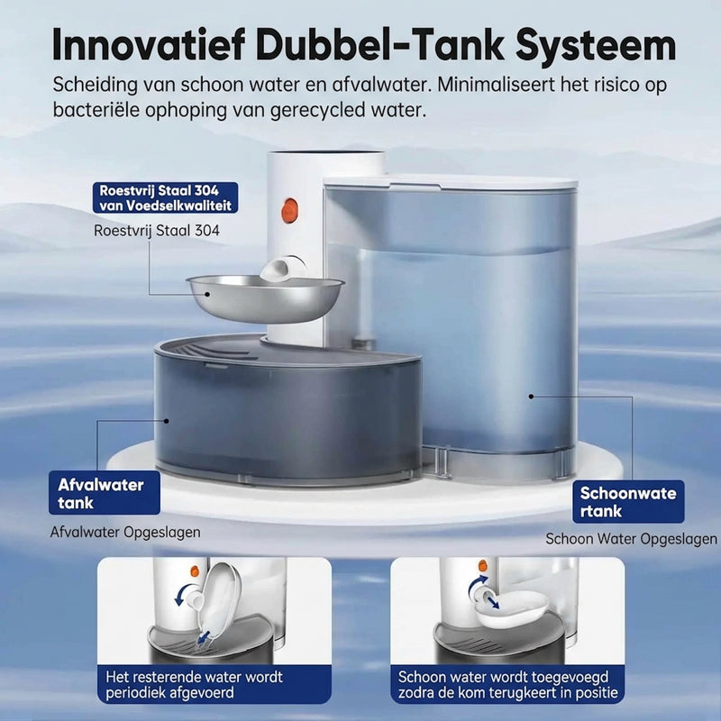 Nee, dat is het unieke voordeel van dit systeem. Omdat het vuile water niet wordt teruggepompt naar de schone tank, maar apart wordt opgevangen, groeien er geen bacteriën in het drinkwater. U hoeft alleen de bak regelmatig schoon te maken.